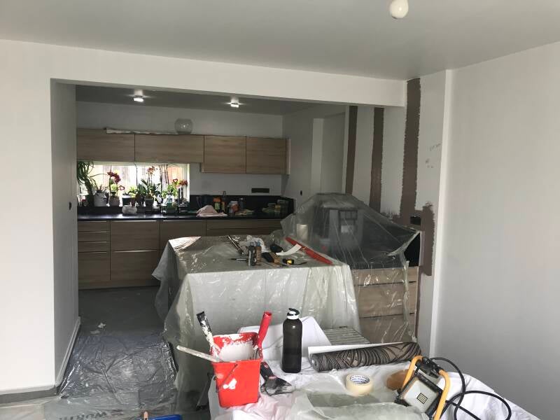 réparation placo, de l'effet projeter, peinture mur, remplacement du parquet stratifier et des plinthe bois